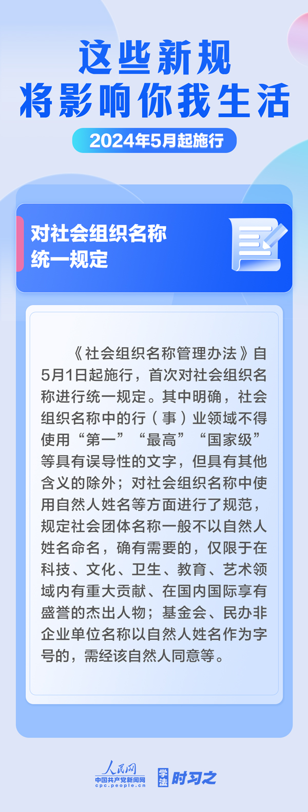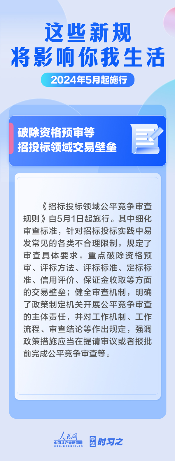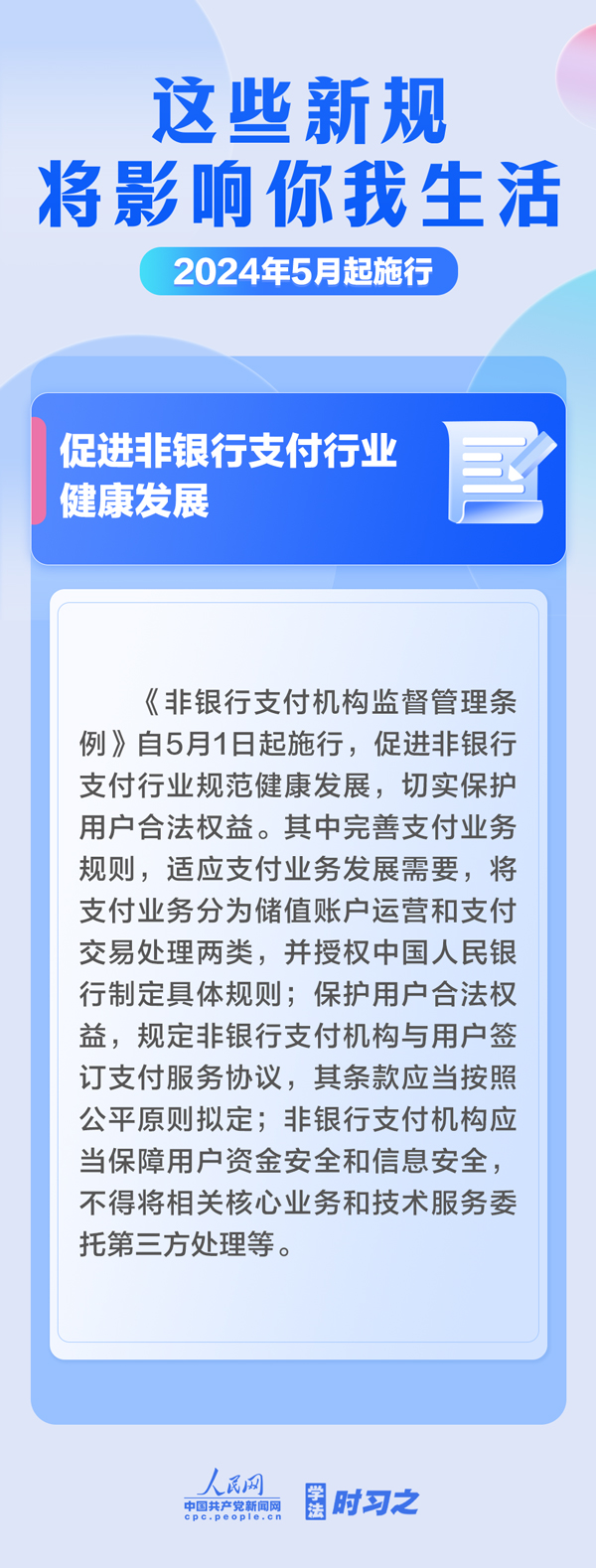 促进非银行支付行业健康发展;首次对社会组织名称进行统一规定;破除资格预审等招投标领域交易壁垒……5月起,这些新规施行,将影响你我生活。