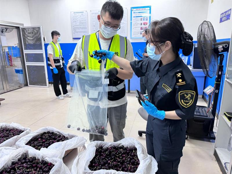 广州白云机场海关关员对新产季进口车厘子进行监管。(受访者供图)