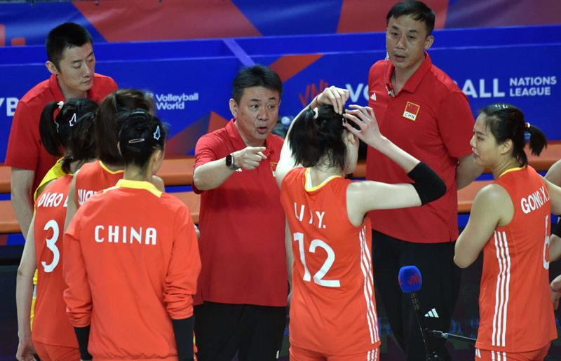 6月16日,中国队主教练蔡斌(中)在比赛间隙指导球员。新华社记者 卢炳辉 摄