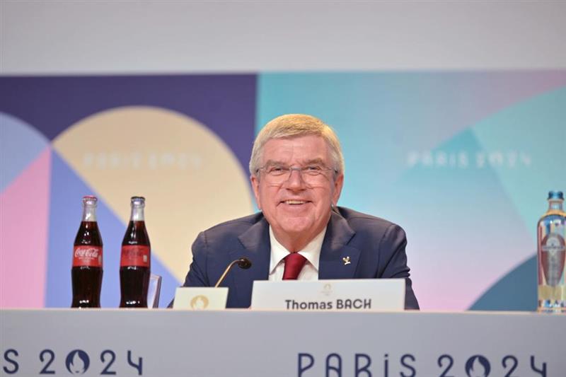 7月23日,国际奥委会主席巴赫在新闻发布会上。当日,第142届国际奥林匹克委员会全会首日新闻发布会在法国巴黎举行。新华社记者 侯昭康 摄