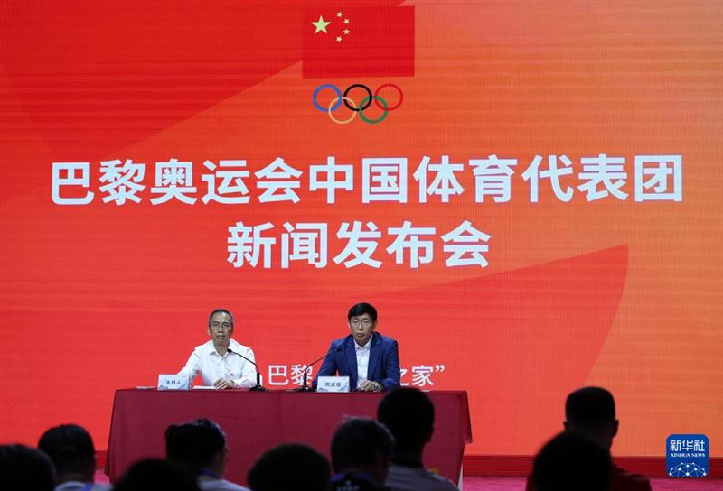 8月6日,国家体育总局副局长、巴黎奥运会中国体育代表团副团长周进强(右)在发布会上介绍情况。新华社记者 曹灿 摄