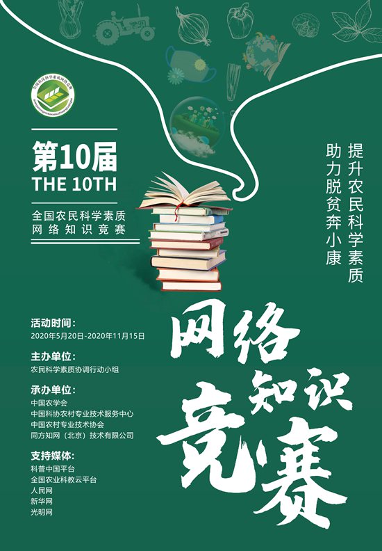 为深入贯彻落实习近平新时代中国特色社会主义思想,落实党的十九大和十九届二中、三中、四中全会精神,落实《中共中央国务院关于实施乡村振兴战略的意见》,落实中国科协、农业农村部《乡村振兴农民科学素质提升行动实施方案(2019-2022年)》的有关要求。5月15日,由农民科学素质协调行动小组主办,中国农学会、中国科协农村专业技术服务中心、中国农村专业技术协会、同方知网(北京)技术有限公司联合承办,第十届《全国农民科学素质网络知识竞赛》正式上线。