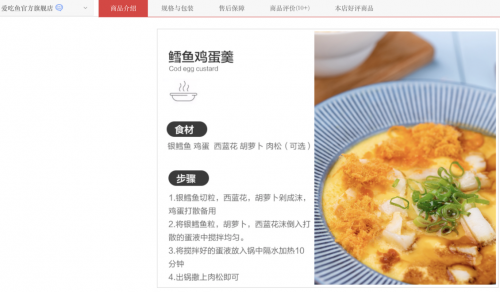“爱吃鱼”提供的是一套优质蛋白辅食解决方案,意在为中国家庭带来北欧的品质味道。因此除了优质产品,爱吃鱼还致力于为客户提供精细化指导和建议以及烹饪方法。在“爱吃鱼”的京东旗舰店的商品页面,可以看到针对具体食材,推荐了各种简单易操作的精美菜谱。