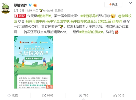 2020年4月30日,由@微博校园 主办的第十届全国大学生绿植领养活动圆满结束。活动自3月12日启动以来,深入贯彻共青团中央《 “美丽中国 • 青春行动”实施方案(2019—2023年)》文件要求,认真落实团十八大关于动员青少年投身生态文明实践的工作部署,呼吁“减霾公益行,青春护蓝天”,以实际行动守护美丽校园。活动在微博及广大学生群体引发了强烈反响,相关话题阅读量74亿,话题讨论增量709万,成为微博全站近期关注度最高的热点话题之一,活动微博在公益领域的平台价值得到很好的释放。