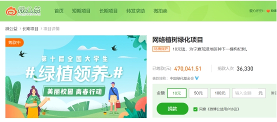 公益无大小,行动即榜样。绿植领养项目首次发起公益募捐,网络植树绿化环保募捐项目累计筹款467397.37元, 捐款人次34588人,将为宁夏荒漠地区种下一棵棵枸杞树,固沙减霾,扶贫助农。