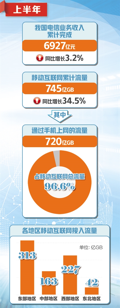 值得注意的是,上半年,移动互联网累计流量达745亿GB,同比增长34.5%;其中,通过手机上网的流量达到720亿GB,同比增长30.4%,占移动互联网总流量的96.6%。6月当月户均移动互联网接入流量达到10.14GB/户,同比增长29.3%,比上年12月份高1.55GB/户。