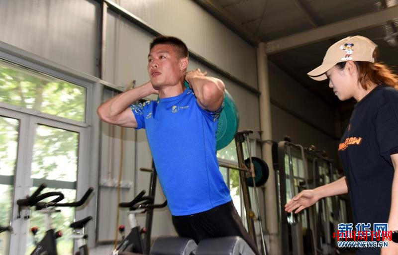 5月24日,教练吴艳英(右)帮助李茂大进行体能训练。 新华社记者 李紫恒 摄