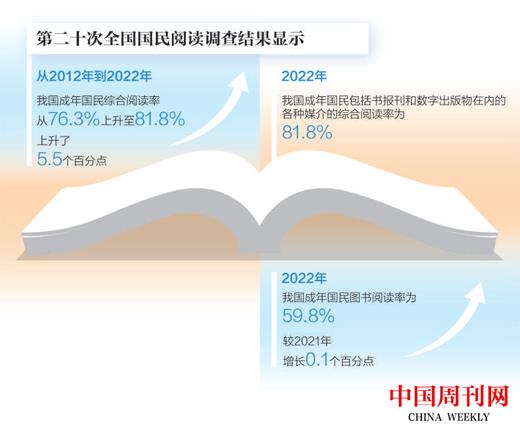 第二届全民阅读大会上,中国新闻出版研究院发布了第二十次全国国民阅读调查结果。数据显示,2022年我国成年国民包括书报刊和数字出版物在内的各种媒介的综合阅读率为81.8%,较2021年的81.6%提升了0.2个百分点。