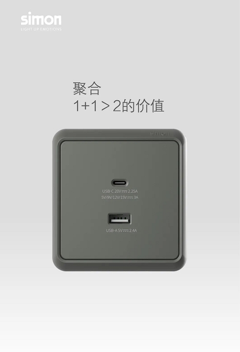 Type A+C 双USB插座,从单一地满足手机等电子产品的充电需求,到以革新技术实现笔记本电脑快充,展现出1+1>2的聚合价值。