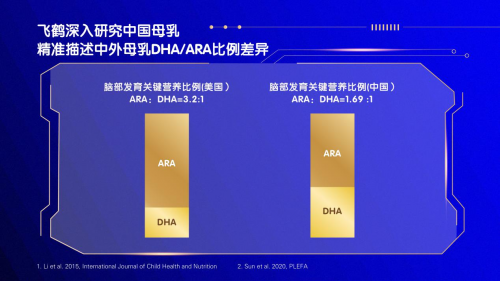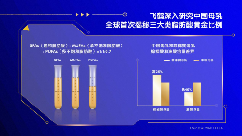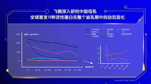 全球首发中国母乳中蛋白质和氨基酸在整个泌乳期动态变化,首次揭示中国母乳中11种活性蛋白成分在6个母乳阶段的变化,精准勾勒出中国母乳三大类脂肪酸关键比例为1:1:0.7,并精准描述了脑部发育重要营养物质DHA/ARA的比例为1:1.69。