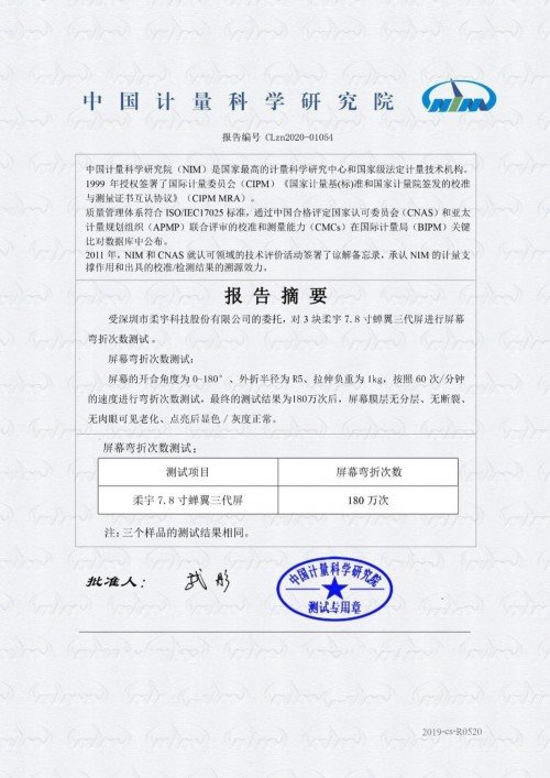 在实际应用中,柔宇科技的第三代蝉翼全柔性屏通过了中国计量科学院权威测试认证,可承受180万次0到180°往复弯折而不损坏。据了解,目前市面上的同类柔性屏可折叠次数普遍都在10-20万次以内,柔宇全柔性屏在技术参数和性能上已位于世界前列。