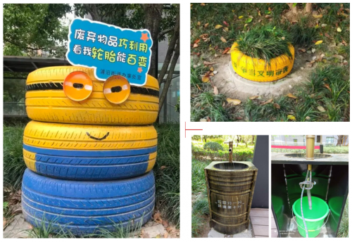 垃圾,是被错放的资源。观邸国际小区的中奥物业团队以油漆彩绘的方式,将废旧轮胎改造为“小黄人”;将盆栽花卉种植在废旧轮胎中,外部再印上环保标语;在洗手台背后镂空底座,废水回收后被用于浇灌非投放时间放置于此的花卉绿植。