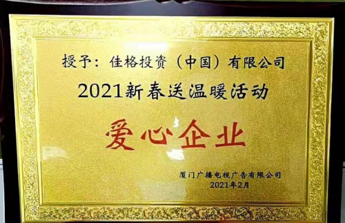以爱筑城,情暖千万家,让城市一线工作者充分感受来自政府及社会各界的关心关爱,欢度温暖祥和、幸福团圆的春节假期,浓浓的爱和关怀在慰问路上蔓延和传递!留下温暖,带走笑容,活动结束后,佳格收获了厦门广播颁发的2021新春送温暖活动“爱心企业”称号,这是对佳格极大的肯定,也鼓舞着佳格要把公益事业坚持下去的决心。
