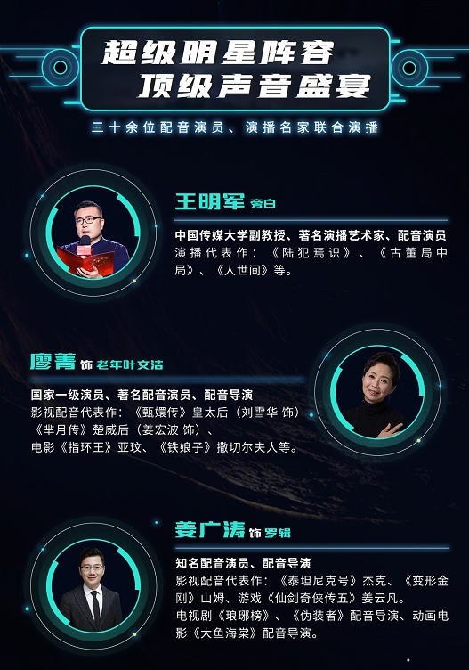 “给岁月以文明,而不是给文明以岁月”。近日,由读客文化出品,王明军、廖青、艾宝良、彭尧、姜广涛、宝木中阳等30余位央广演播名家联合演播的《三体》科幻有声剧重磅上线懒人听书,引发三体世界声音盛宴。
