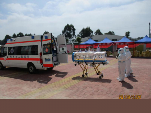 陆丰市新冠肺炎秋冬季疫情防控(救治)应急处置演练,医护人员演示负压救护车及负压担架