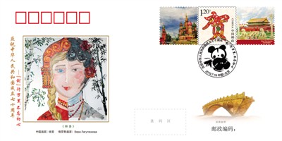 中国—俄罗斯纪念封以中俄艺术家合作的油画《和美》为主图,展示了一位美丽少女的形象。少女一半是中国面孔,身着典型戏剧装扮,背景是代表中国特色的挺拔翠竹;另一半是俄罗斯面孔,身着俄罗斯传统服饰,背景是代表俄罗斯风情的亭亭白桦。