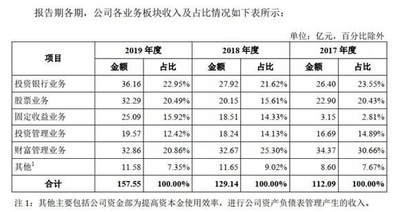 招股书显示,报告期内,公司业务结构日益均衡,并保持良好的发展势头,抵御市场波动和防范风险的能力不断增强。2019 年,公司实现营业收入157.55亿元,投资银行业务、股票业务、固定收益业务、投资管理业务和财富管理业务五大业务板块的收入占比分别为22.95%、20.49%、 15.92%、 12.42%及 20.86%。