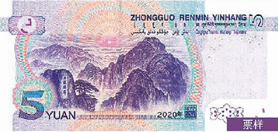 正面中部面额数字调整为光彩光变面额数字“5”,左下角和右上角局部图案调整为凹印对印面额数字与凹印对印图案。左侧增加装饰纹样,调整面额数字白水印的位置,调整左侧花卉水印、左侧横号码、中部装饰团花、右侧毛泽东头像的样式。取消中部全息磁性开窗安全线和右侧凹印手感线。背面左上角和右下角局部图案调整为凹印对印面额数字与凹印对印图案,调整主景、面额数字的样式。票面年号改为“2020年”。