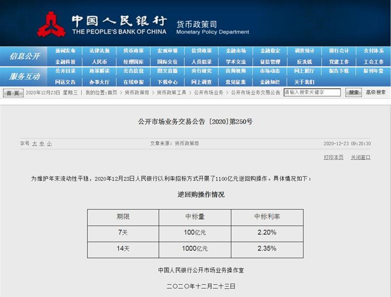 央行23日开展1100亿逆回购,实现净投放1000亿