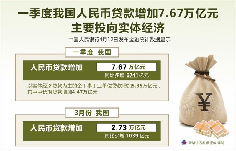 一季度人民币贷款增加七点六七万亿元 更多信贷资源流向实体经济