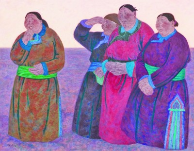 通过周章科的作品《景迈·小日子》,我们深深地感受到深入生活对于画家自我完善的重要性。当你带着迫切的愿望深入生活时,可能会发现一些以往在内心并不确定的意外的新答案。尽管这幅画是写实的,画面中却有很多带着强烈绘画性的感性表述,表达形式虽简洁单纯,却呈现出一种提纯后的美感。白露洋、宋能轩的作品《大江大河3》中,画家力求营造出视觉上的距离感,形成耐人寻味的诗意幻境。颉元芳通常描绘的是草原牧民的生活,听他们低沉的歌声,看他们古朴的舞蹈。在作品《那达慕之二》中,她捕捉到鲜活的牧区生活场景与情味。画面中,牧民们深情凝视着远方的牧区,乐观、坚毅的牧民形象构成了这个时代最朴素的牧区人物的群像。梁国辉在创作作品《杂事·丝》时,将画面的形式感作为自己情感表达的通道,他的作品再现了情节的叙事性,而且在具象与表现之间探索绘画的当代性,最大限度地发掘了水彩画艺术语言的表现力。