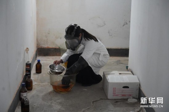 修复师刘蓥在佩戴防毒面具,准备使用专门的药水清洗瓷片上的杂质(12月3日摄)。新华社记者 周密 摄