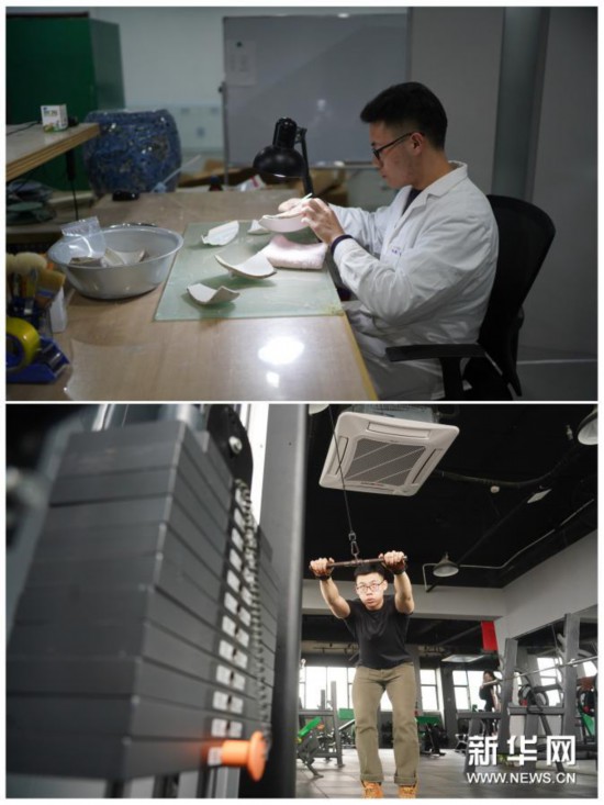 拼版照片:上图为修复师龚尚开源在工作室修复瓷器(12月2日摄);下图为龚尚开源在健身房健身(12月3日摄)。新华社记者 周密 摄