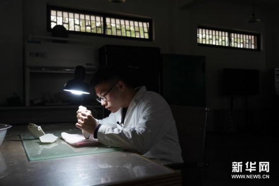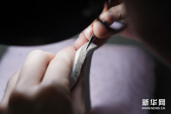 修复师龚尚开源在工作室清理碎瓷片断面上的杂质(12月2日摄)。新华社记者 周密 摄