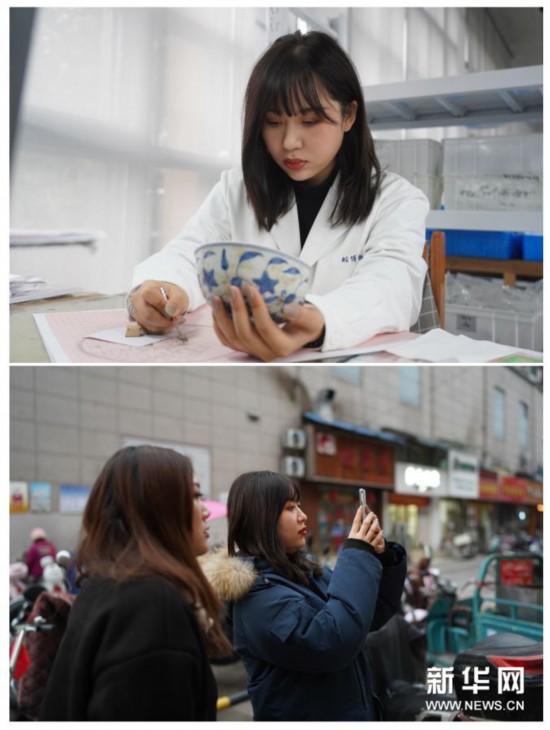 拼版照片:上图为修复师何奕慧在工作室绘制一件瓷器的纹样;下图为何奕慧在景德镇一条商业街上,与好朋友拍摄抖音视频(12月3日摄)。新华社记者 周密 摄