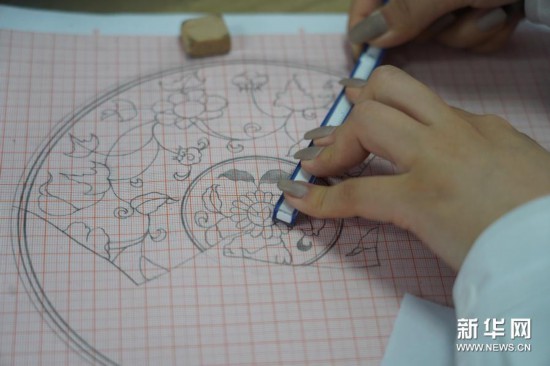 修复师何奕慧在测量绘制一件瓷器的图案,将三维瓷器上的图案还原到二维的纸面上,必须要经过仔细的测量(12月3日摄)。新华社记者 周密 摄