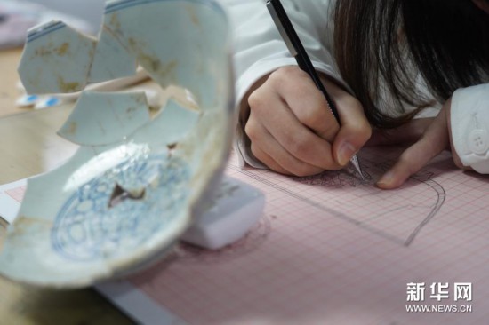 修复师何奕慧在测量一件瓷器,将三维瓷器上的图案还原到二维的纸面上,必须要经过仔细的测量(12月3日摄)。新华社记者 周密 摄