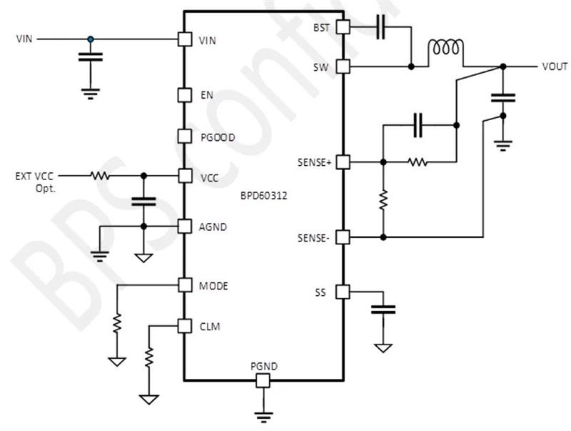 上海晶丰明源的DC-DC芯片BPD60312支持者也非常多,它是一款集成同步降压转换器,支持2.7V~16V的输入电压,输出支持12A直流负载。芯片采用了低静态电流方案,在轻负荷下节省功耗。为了满足不同的应用要求,芯片允许用户调整MODE引脚对地电阻来设置开关频率,CCM/DCM模式选项和内部LDO输出。SENSE+ 和SENSE- 引脚的远端监测功能,可以帮助芯片实现更精确的输出监控。此外,芯片还提供了一个可灵活设置的软启动计时器。