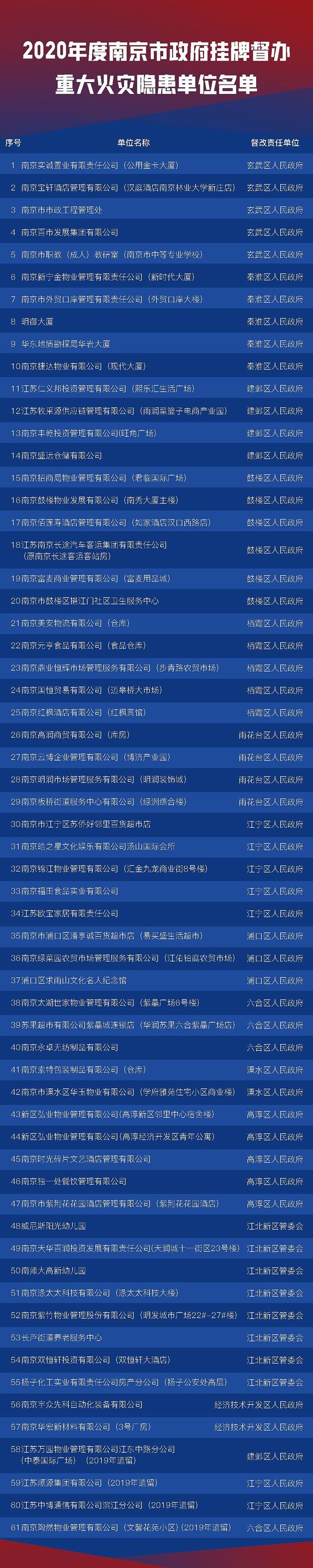 今年以来,南京市消防救援支队继续深入开展以人员密集场所、高层地下建筑、火灾高危单位为重点的火灾隐患排查整治行动。为加强重大火灾隐患督察整改,有效预防和遏制较大以上火灾事故,确保南京市消防安全形势持续稳定,经市政府研究,决定对南京实诚置业有限责任公司(公用金卡大厦)、南京新宁金物业管理有限责任公司(新时代大厦)、江苏仁义邦投资管理有限公司(熙乐汇生活广场)等57处重大火灾隐患实施市级挂牌督办。