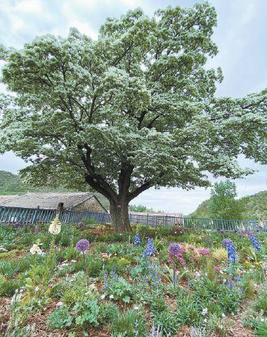 古树高约13米,主干1.3米处分为两主枝,向上延展成蘑菇形树冠,平均冠幅约16米。几许山风轻拂,花叶零星飘落,暗香幽微。“5月10日,古树进入盛花期,白色小花很快从阳面铺到阴面。”苏家峪村党支部书记王银江说,上世纪80年代,村里修建了周长16米的金属护栏,以保护古树。“我们打小儿就知道这是一棵很老的树,不过就连父辈都说不清它的岁数。还是前些年专业部门来测量,我们才知道古树有580岁了。”