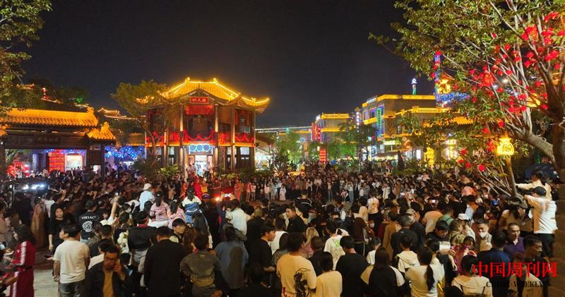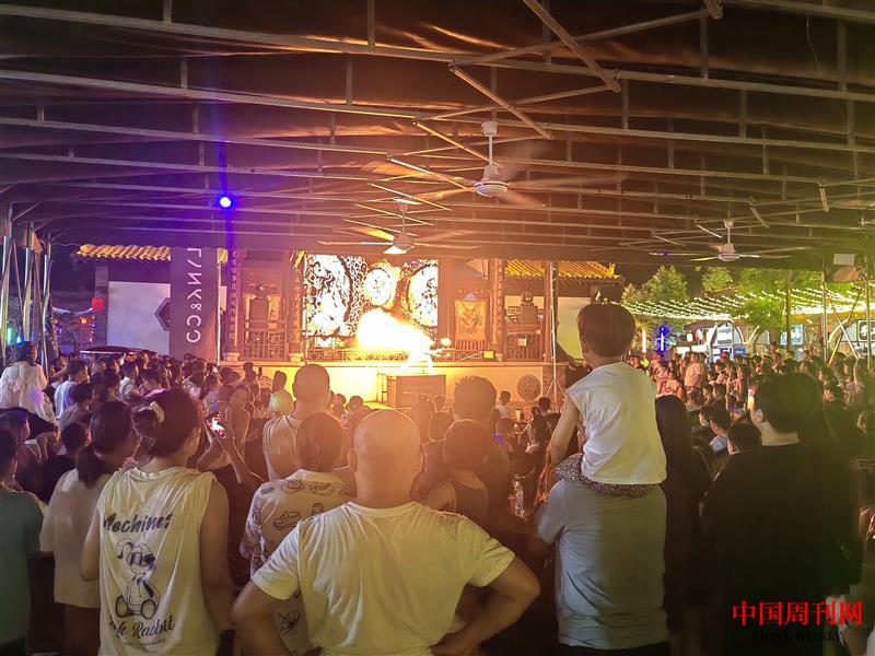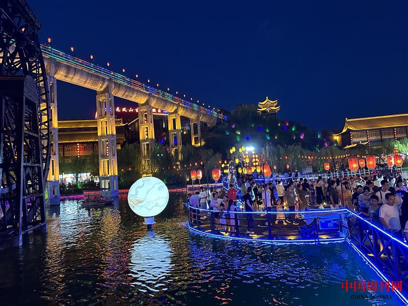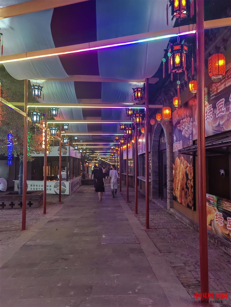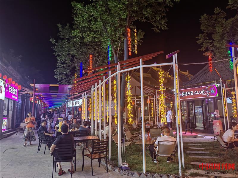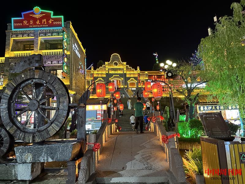 景区夜色最美,建筑物的亮化装饰、古镇门店的各色霓虹招牌,把景区打扮得流光溢彩。纵横交错的街巷里游人如织,一些年轻人身着汉服漫步其中,颇有穿越历史的感觉;古玩店、照相馆等一些老行当门店也勾起了人们对许久前的回忆;露天剧场精彩绝伦的演出,引来声声喝彩;灯光秀与游乐场交相生辉,处处都是热闹非凡的场景……龙凤山夜经济的热烈爆棚成为当地致富的引擎,不仅带动了消费,也为产业发展带来了机会。
