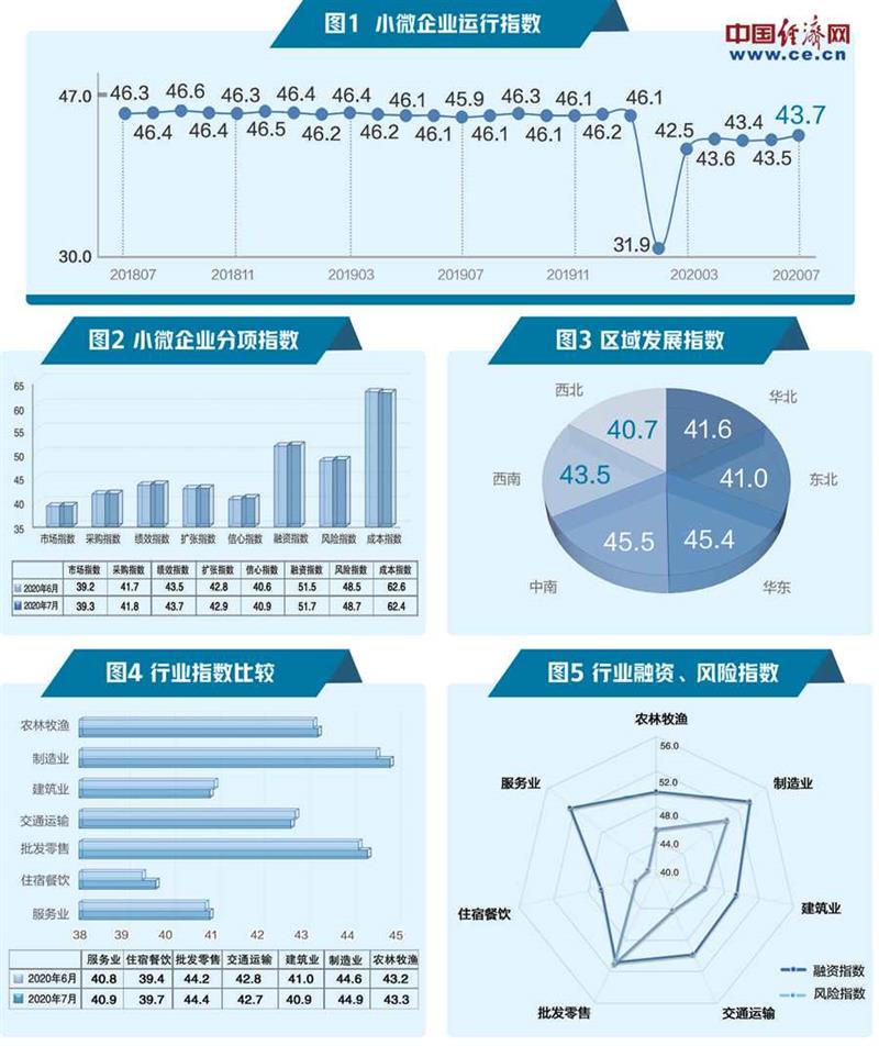 2020年7月份,“经济日报—中国邮政储蓄银行小微企业运行指数”(见图1)为43.7,较上月上升0.2个点,本月小微企业运行指数持续回升。