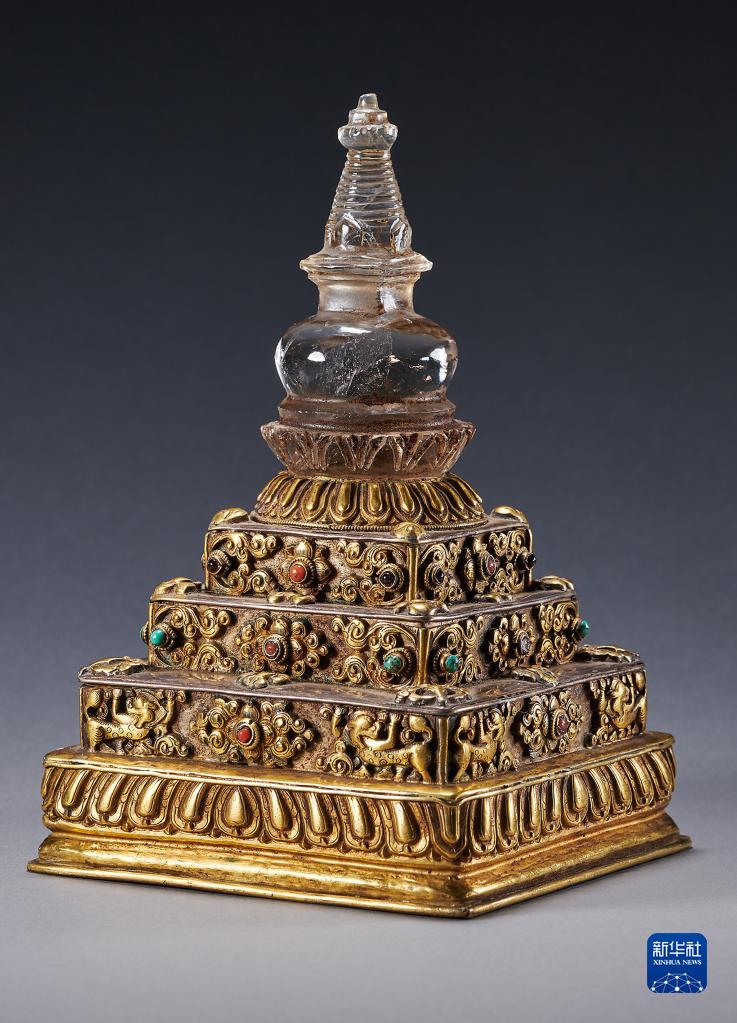 铜鎏金水晶嵌宝石供养塔(资料照片)。新华社发