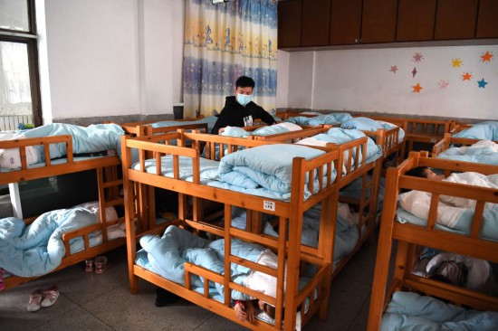 12月18日,孙浩在合肥钢铁集团第一幼儿园看护孩子们午睡。