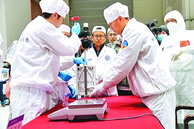 航天科技集团五院的研制人员在为从“嫦娥五号”返回器中取出的月球样品称重。光明图片