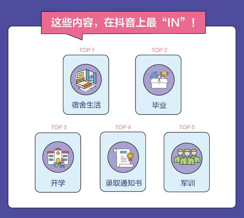 “军训”、“开学”、“毕业”等青春、励志、正能量内容,备受用户关注。其中“宿舍生活”类视频真实反映大学生“寝室文化”,鲜活又接地气,最受抖音用户欢迎,相关视频播放量达86亿次;而宿舍也位居食堂、操场、教室、校门之前,成为最受大学生创作者青睐的“取景地”。
