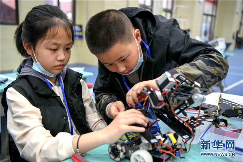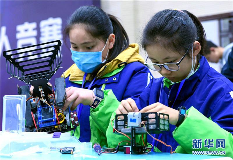 3月27日,参赛选手在安徽省铜陵市铜官区青少年机器人竞赛综合技能赛项目中进行组装机器人比拼。