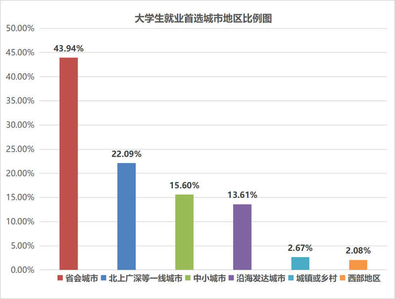 在就业意向城市选择中,一线城市、省会城市依然是学生相对偏好的选择。柳丰林认为,从职业发展角度来讲,大城市中优质企业相对集中,创新创业政策相对成熟,人才引进条件相对优厚,生活保障相对便利,平台大,机会多,可以帮助学生快速完成职场转变,帮助他们适应职场节奏,开拓职业视野。不过,大城市中人才过于集中,学生成长成才面临更多的竞争与考验,也客观存在局部人才过剩,学历过度消费的现象,不利于毕业生职业初期的发展。“从长远发展角度来说,毕业生还是应该避免随大流,结合自己的特点与职业发展目标,到国家需要的地区与行业建功立业,在青春奋斗中成就自我,奉献价值。”