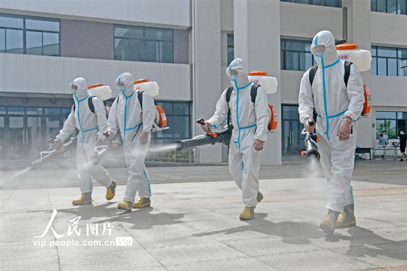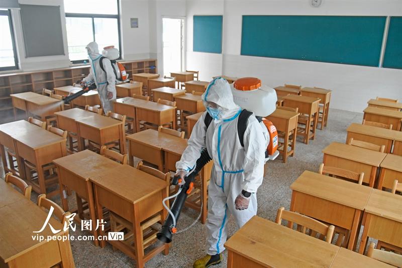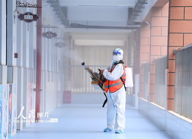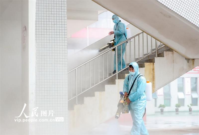 8月26日,安徽省淮北市相山区各中小学陆续开展校园封闭消杀防疫工作,邀请专业机构针对校园、食堂、教室、图书馆等区域以喷洒消毒液的方式进行彻底清洁消毒,为即将返校的学生们营造安全卫生的校园环境。陈文骁摄(人民图片)