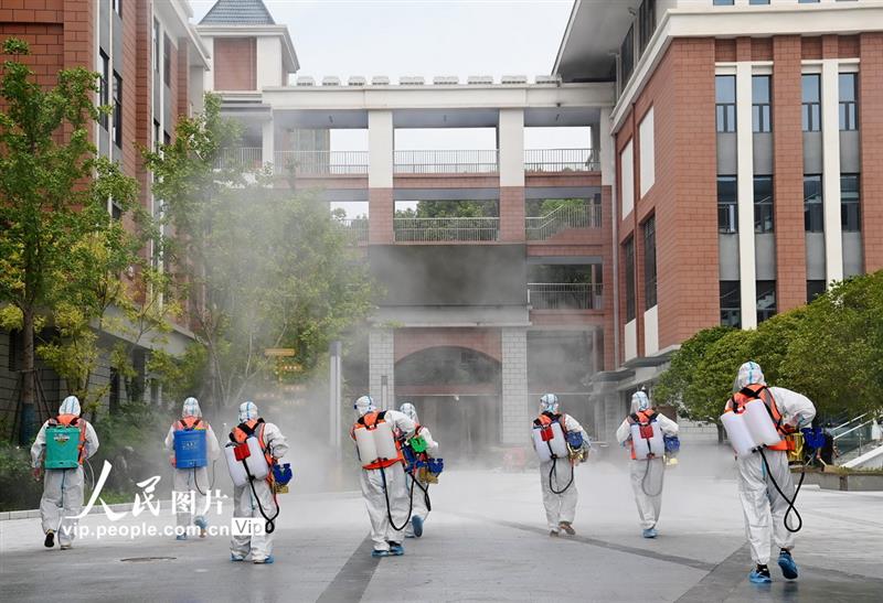 秋季开学在即,四川省华蓥市义务工作者协会及时组织义工连续对华蓥中学、红军小学、清溪路幼儿园等城区中小学校及幼儿园进行全面消毒杀菌,构筑疫情防控防护网,切实有效保障新学期师生的身体健康与生命安全。邱海鹰摄(人民图片网)