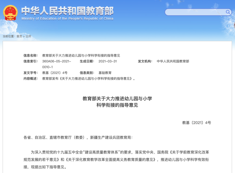 教育部:小学将一年级上学期设置为入学适应期