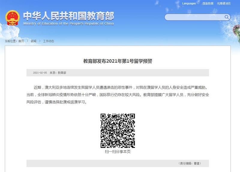 教育部发布2021年第1号留学预警:谨慎选择赴澳或返澳学习