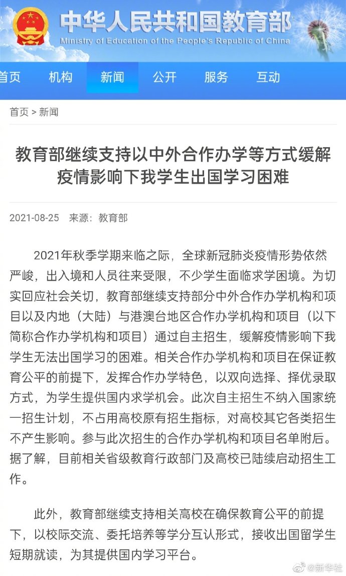教育部继续支持以中外合作办学等方式缓解疫情影响下我学生出国学习困难