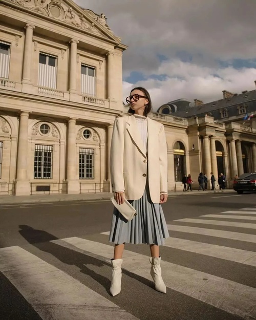 小西装和百褶裙真的就是天生一对了,百褶裙的轻盈文艺搭配上西装,好看又不失正式感。而且外套还能轻松修饰腰臀线条,梨形身材的女生还在等什么呢~