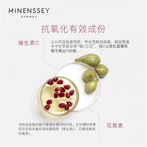 该系列产品蕴含两大传奇抗老植物菁萃。维C之王卡卡杜李精华,它是澳洲独有的植物,是全球有记录的维生素C含量最高的植物(高达3000毫克/100g),是柑橘维生素C含量的100倍。抗氧化之王红石榴精华,被称为 “月夜红宝石”它是一种具有高浓度石榴多酚+花青素的水果,堪称抗氧化水果之王,是绿茶抗氧能力的4倍。除此以外,Minenssey蔓索卡卡杜焕活系列套组共有四件单品。