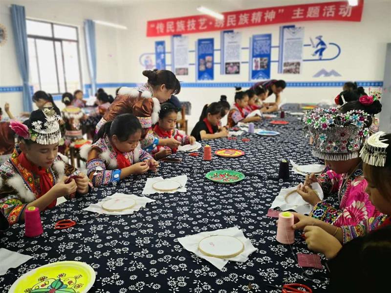 苗族学生在课堂上练习苗绣。中国日报记者 张莉 摄